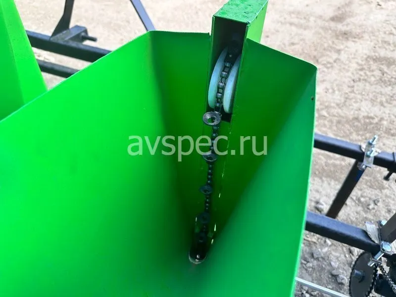 Для обеспечения стабильной работы на неровной почве применена двовальная система механизма дозирования с разделенным приводом. Шаг посадки в ряду: 110 мм, 125 мм, 140 мм, регулируется изменением передаточного числа на цепном редукторе. Для компенсации длины цепи использован натяжитель. Сошник и заделки регулируемые, глубина посадки – 60-80 мм. Ширина междурядий регулируется в пределах 200–330 мм. Ширина пути – 2220 мм.
